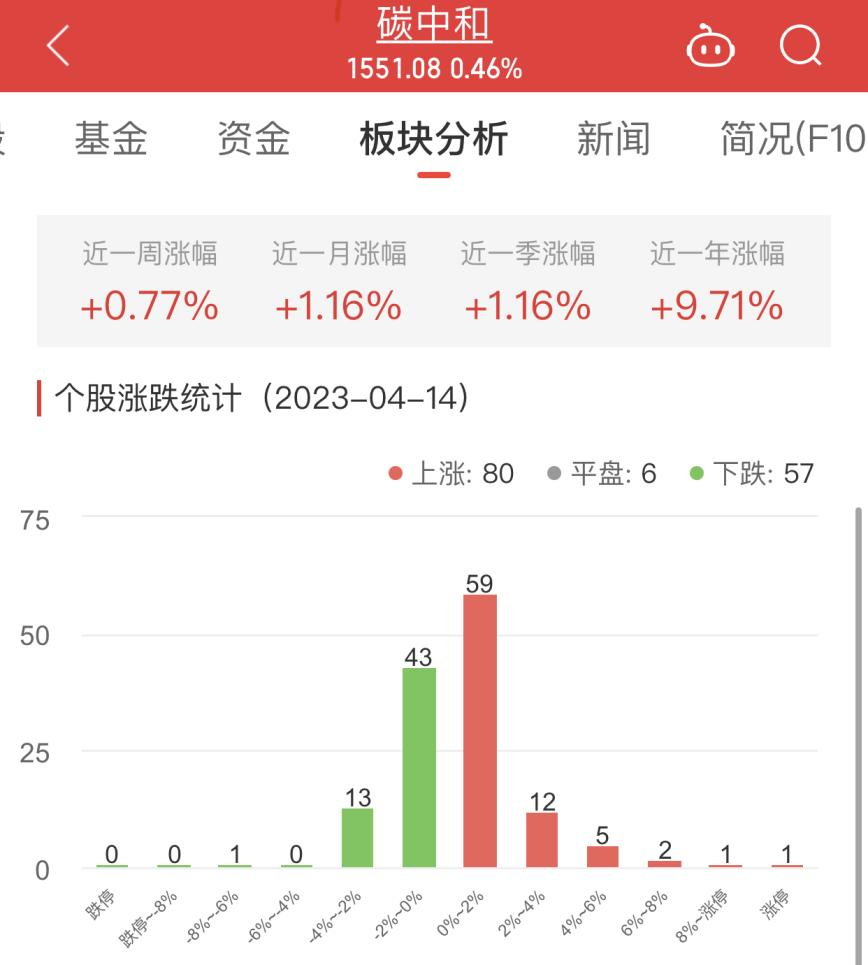中国经济网北京4月14日讯 今日,碳中和板块整体涨幅0.46%,其中80只股票上涨,6只股票平盘,57只股票下跌。