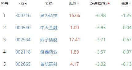 泉为科技、中天金融、西子洁能、紫鑫药业、首航高科位列涨幅榜后五位,涨幅分别为-6.98%、-3.85%、-3.71%、-3.57%、-3.02%。