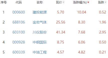其中,建投能源、金宏气体、川仪股份、中钢国际、中油工程位列板块涨幅前五位,涨幅分别为10.04%、8.30%、7.68%、6.06%、4.82%。