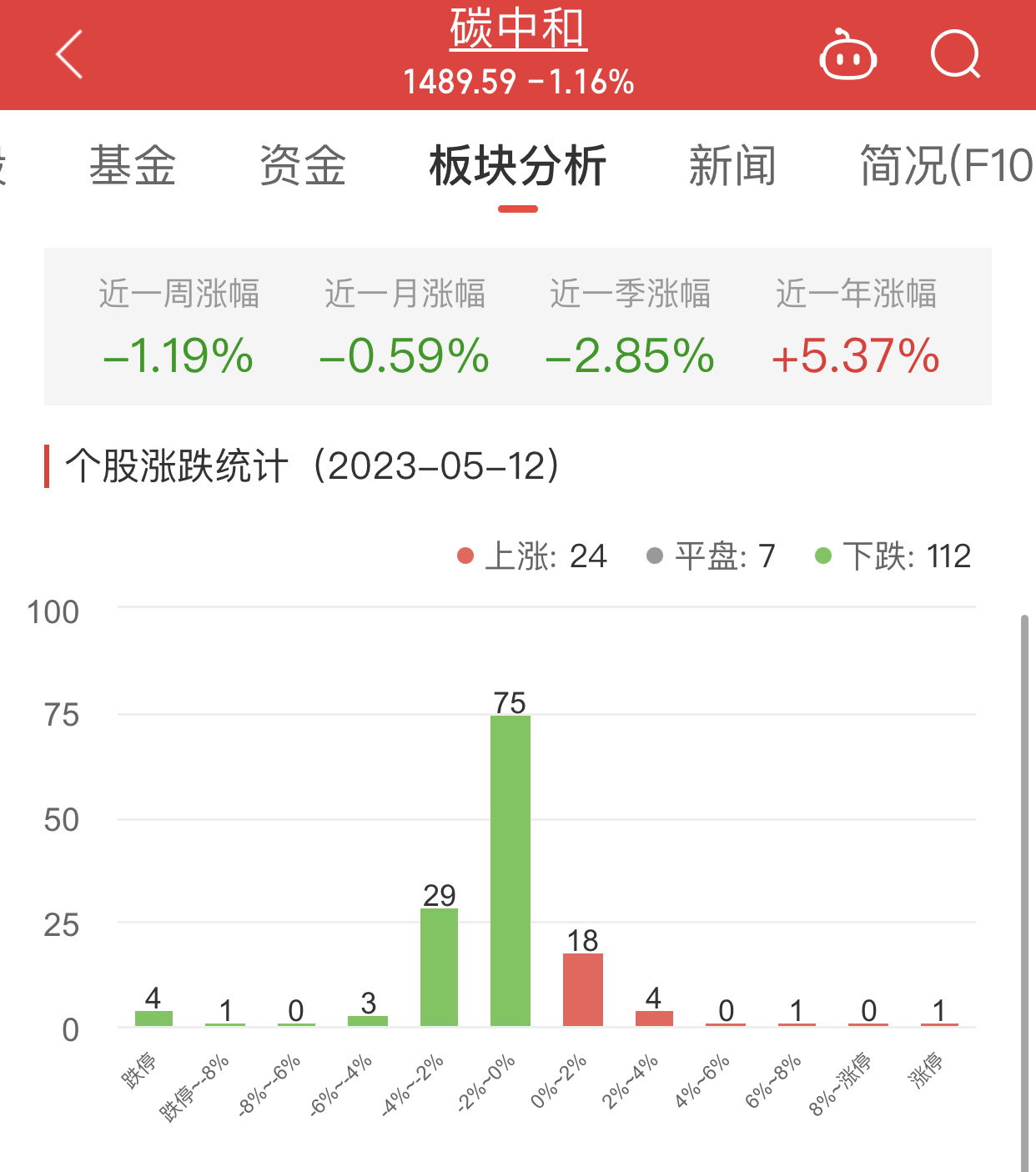 中国经济网北京5月12日讯 今日,碳中和板块整体跌幅1.16%,其中24只股票上涨,7只股票平盘,112只股票下跌。