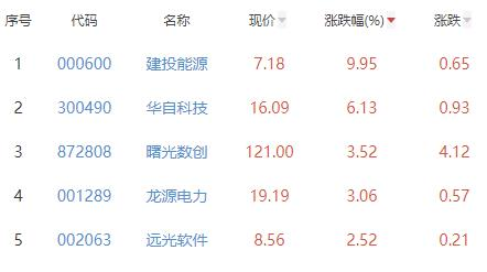 其中,建投能源、华自科技、曙光数创、龙源电力、远光软件位列板块涨幅前五位,涨幅分别为9.95%、6.13%、3.52%、3.06%、2.52%。