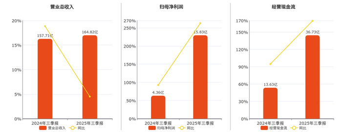 公司营业总收入为164.82亿元,在已披露的同业公司中排名第23。归母净利润为15.83亿元,在已披露的同业公司中排名第27,较去年同报告期归母净利润增加11.06亿元,实现2年连续上涨,同比较去年同期上涨231.79%。经营活动现金净流入为36.73亿元,在已披露的同业公司中排名第30,较去年同报告期经营活动现金净流入增加15.75亿元,实现2年连续上涨,同比较去年同期上涨75.07%。