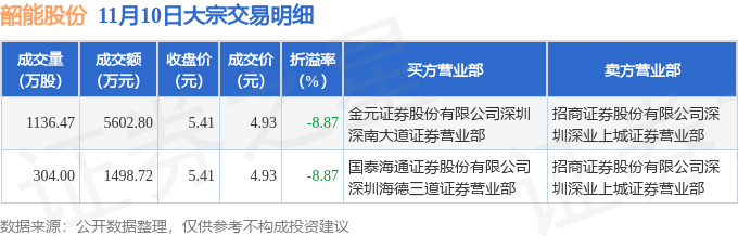 证券之星消息,11月10日韶能股份发生大宗交易,交易数据如下: