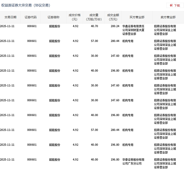 11月11日,韶能股份大宗交易成交404.7万股,成交额1991.12万元,占当日总成交额的15.1%,成交价4.92元,较市场收盘价5.45元折价9.72%。