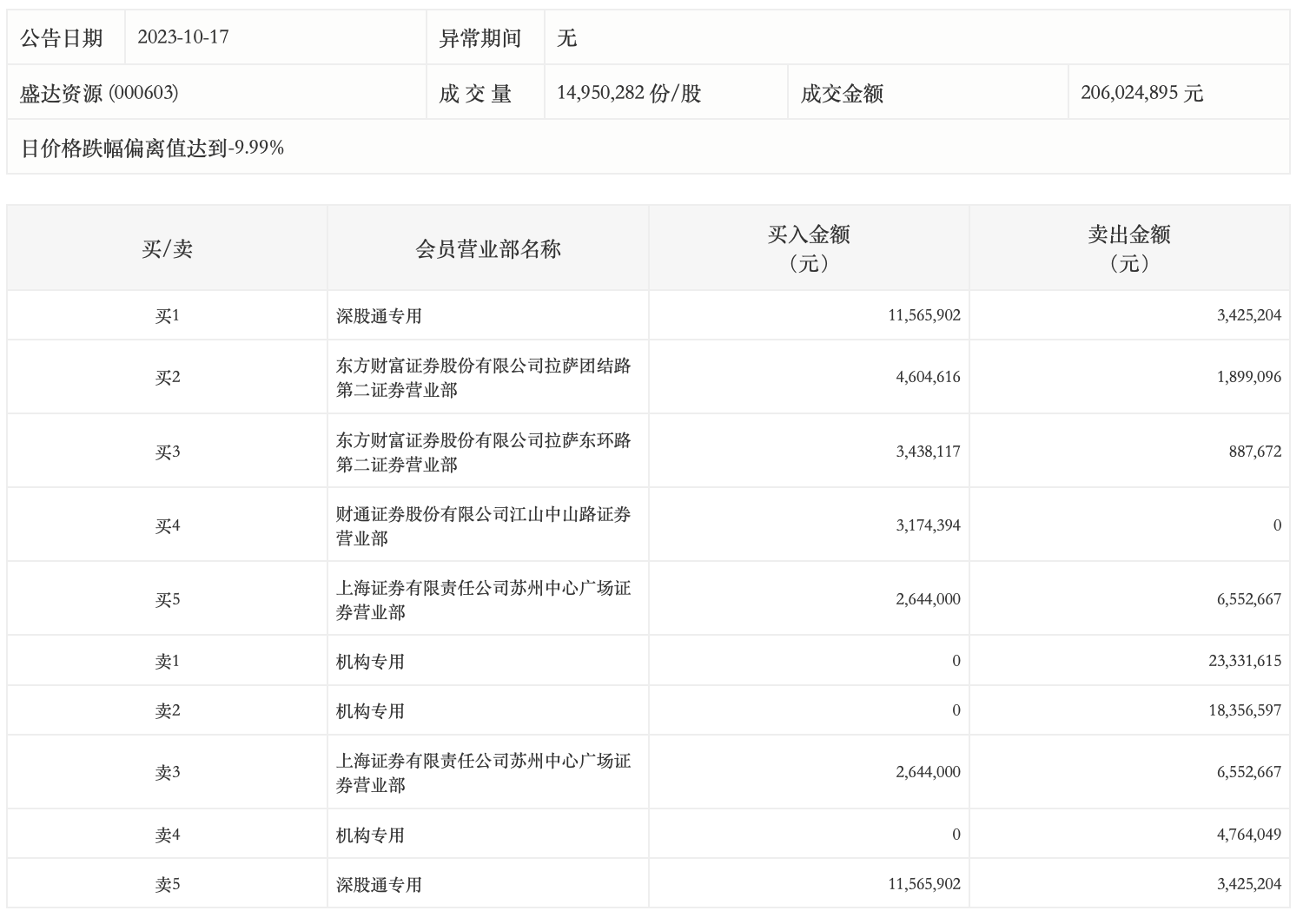 10月17日,盛达资源今日跌停,全天换手率达2.54%,振幅达9.19%。龙虎榜数据显示,营业部席位合计净卖出3378.99万元。其中,机构合计净卖出4645.23万元。此外,上海证券苏州中心广场证券营业部、深股通专用分别卖出655.27万元、342.52万元;深股通专用、东方财富证券拉萨团结路第二证券营业部分别买入1156.59万元、460.46万元。