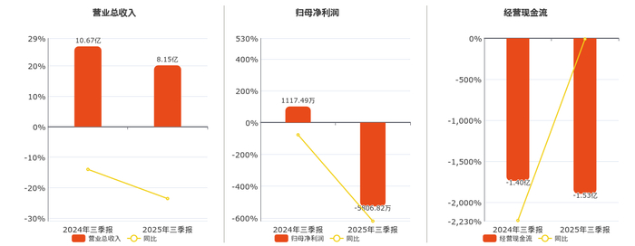 公司营业总收入为8.15亿元,在已披露的同业公司中排名第21,较去年同报告期营业总收入减少2.52亿元,同比较去年同期下降23.59%。归母净利润为-5806.82万元,在已披露的同业公司中排名第24,较去年同报告期归母净利润减少6924.31万元,同比较去年同期下降619.63%。经营活动现金净流入为-1.53亿元,在已披露的同业公司中排名第23,较去年同报告期经营活动现金净流入减少1264.56万元。