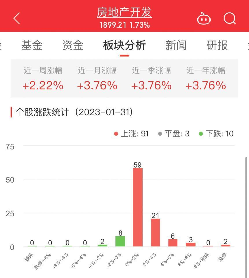 中国经济网北京1月31日讯 今日,房地产开发板块整体涨幅1.73%,其中91只股票上涨,3只股票平盘,10只股票下跌。