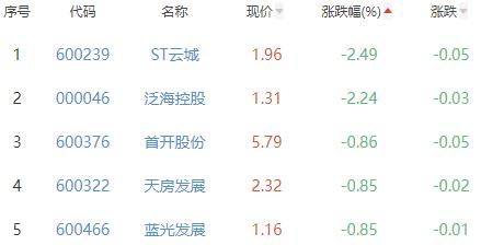 ST云城、泛海控股、首开股份、天房发展、蓝光发展位列涨幅榜后五位,涨幅分别为-2.49%、-2.24%、-0.86%、-0.85%和-0.85%。