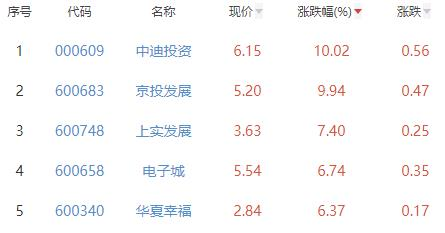 其中,中迪投资、京投发展、上实发展、电子城、华夏幸福位列板块涨幅前五位,涨幅分别为10.02%、9.94%、7.40%、6.74%和6.37%。