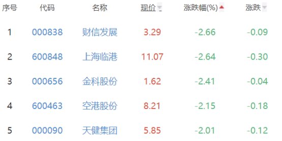 财信发展、上海临港、金科股份、空港股份、天健集团位列板块涨幅榜后五位,涨幅分别为-2.66%、-2.64%、-2.41%、-2.15%、-2.01%。