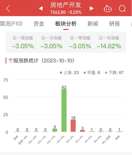 中国经济网北京10月10日讯今日,房地产开发板块整体涨幅-0.25%,其中23只股票上涨,6只股票平盘,67只股票下跌。