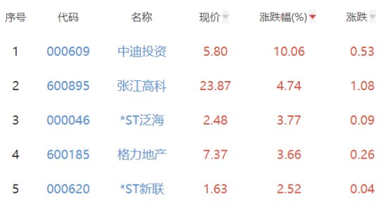 其中,中迪投资、张江高科、*ST泛海、格力地产、*ST新联位列板块涨幅榜前五位,涨幅分别为10.06%、4.74%、3.77%、3.66%、2.52%。