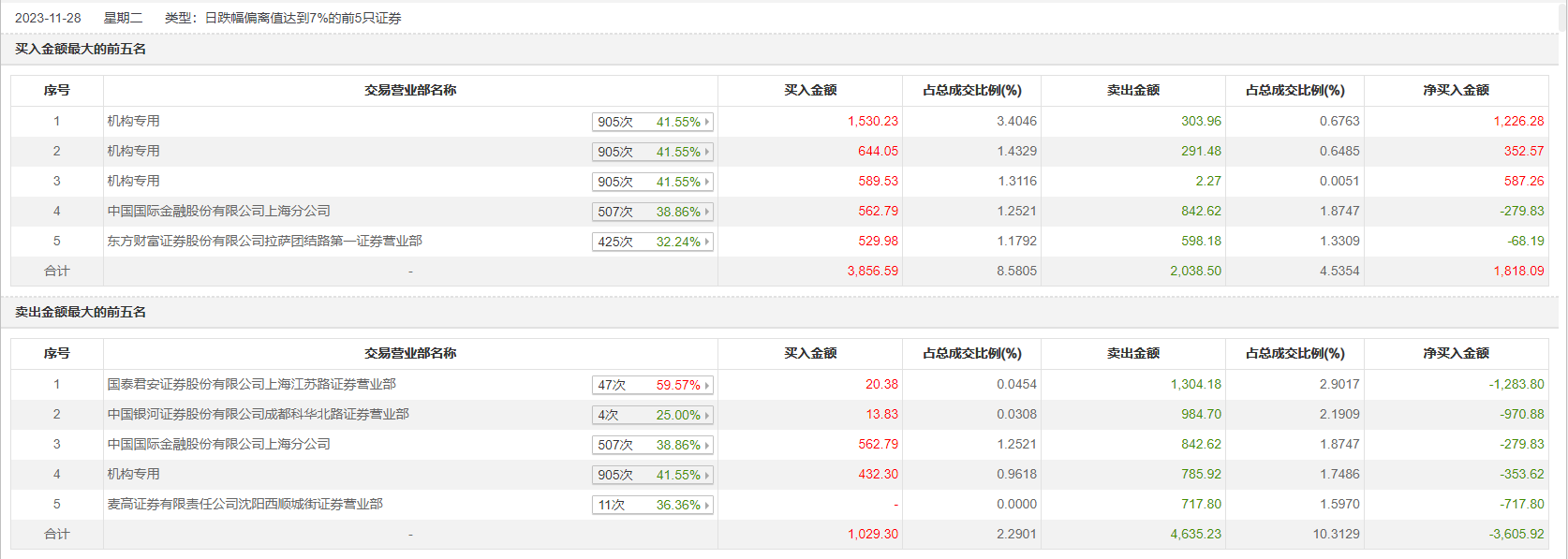 11月28日,中迪投资今日跌停,龙虎榜数据显示,上榜营业部席位全天成交1.02亿元,占当日总成交金额比例为22.59%。其中,买入金额为4323.1万元,卖出金额为5831.11万元,合计净卖出1508.01万元。
