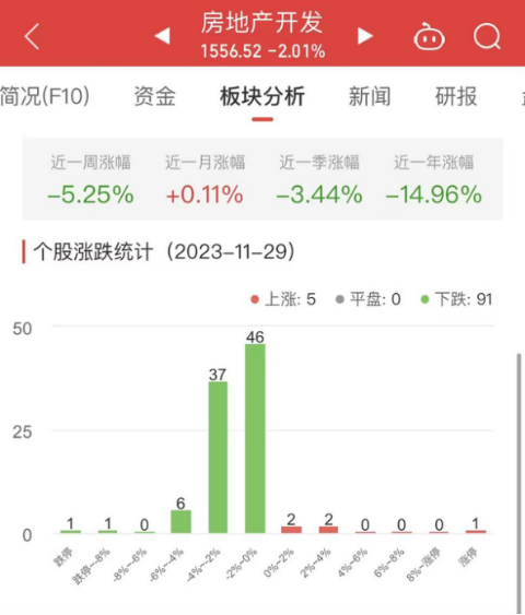 中国经济网北京11月29日讯今日,房地产开发板块整体涨幅-2.01%,其中5只股票上涨,91只股票下跌。