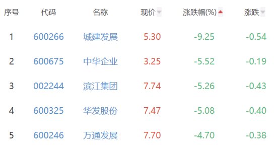 城建发展、中华企业、滨江集团、华发股份、万通发展位列板块涨幅榜后五位,涨幅分别为-9.25%、-5.52%、-5.26%、-5.08%、-4.70%。