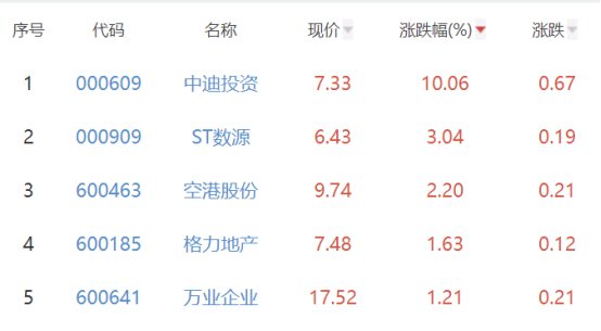 其中,中迪投资、ST数源、空港股份、空港股份、万达企业位列板块涨幅榜前五位,涨幅分别为10.06%、3.04%、2.20%、1.63%、1.21%。