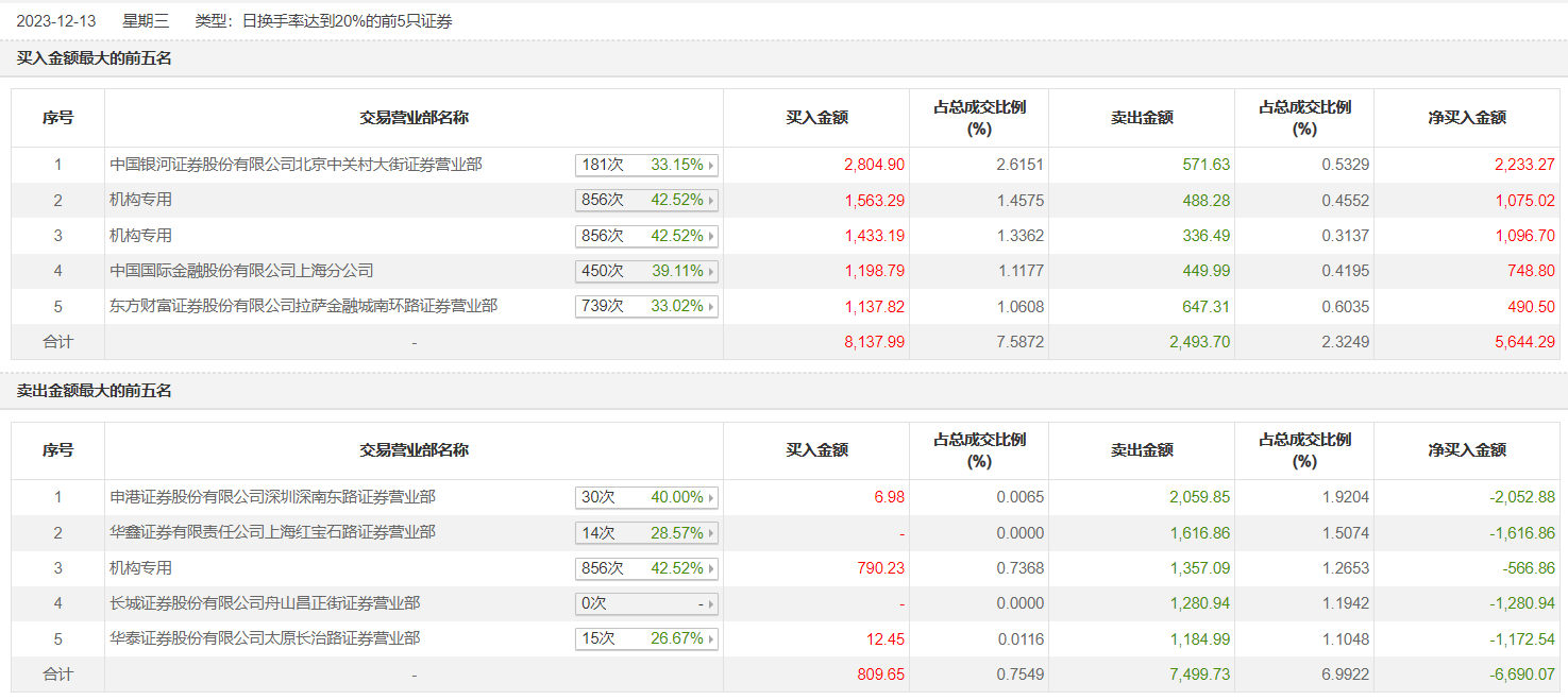 具体来看,机构买入3786.71万元,卖出2181.86万元,合计净买入1604.85万元。此外,知名游资现身龙虎榜,申港证券深圳深南东路证券营业部、炒股养家(华鑫证券上海红宝石路证券营业部)分别卖出2059.85万元、1616.86万元;中国银河证券北京中关村大街证券营业部、中国国际金融上海分公司分别买入2804.90万元、1198.79万元。