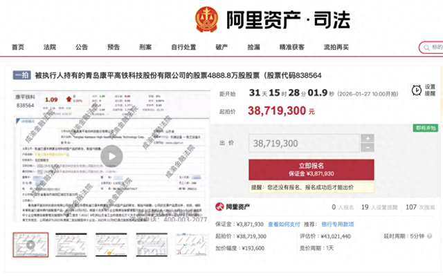 公告显示,ST中迪于当日在“阿里资产·司法”网站获悉,公司所持康平铁科4888.8万股股票,占康平铁科总股本30.04%,占本公司持有康平铁科股票数量100%的股票,将于2026年1月27日10:00至2026年1月28日10:00(即24小时,延时除外)在该平台公开拍卖。