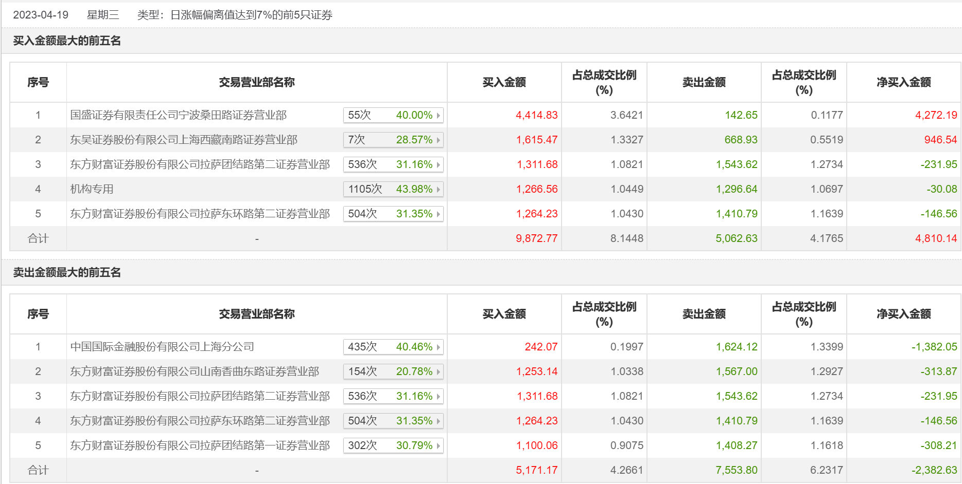 具体来看,机构买入1266.56万元,卖出1296.64万元,合计净卖出30.08万元。此外,知名游资现身龙虎榜,宁波桑田路(国盛证券宁波桑田路证券营业部)、东吴证券上海西藏南路证券营业部分别买入4414.83万元、1615.47万元;中国国际金融上海分公司、东方财富证券山南香曲东路证券营业部分别卖出1624.12万元、1567.00万元。