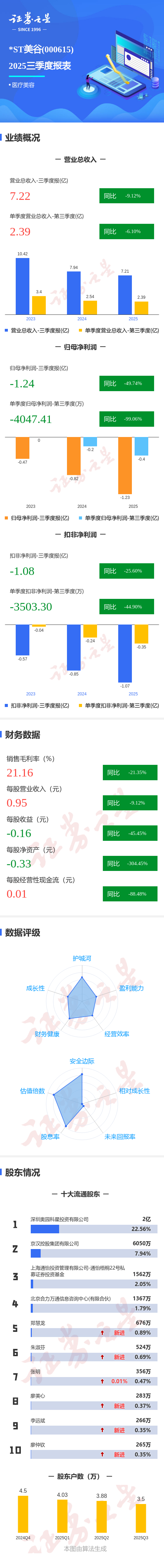 图解*ST美谷三季报:第三季度单季净利润同比下降99.07%