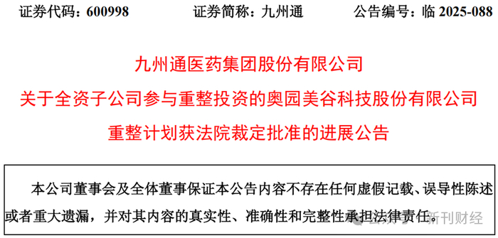 12月16日,湖北省襄阳市中级人民法院的一纸民事裁定书((2025)鄂06破17号),终结了奥园美谷科技股份有限公司(000615.SZ,以下简称“奥园美谷”)的重整程序,同时也标志着医药商业巨头九州通医药集团股份有限公司(600998.SH,以下简称“九州通”)正式踏入了这场资本博弈。12月17日,九州通如期发布进展公告,宣布其全资子公司九州产投公司参与重整投资的计划获批。