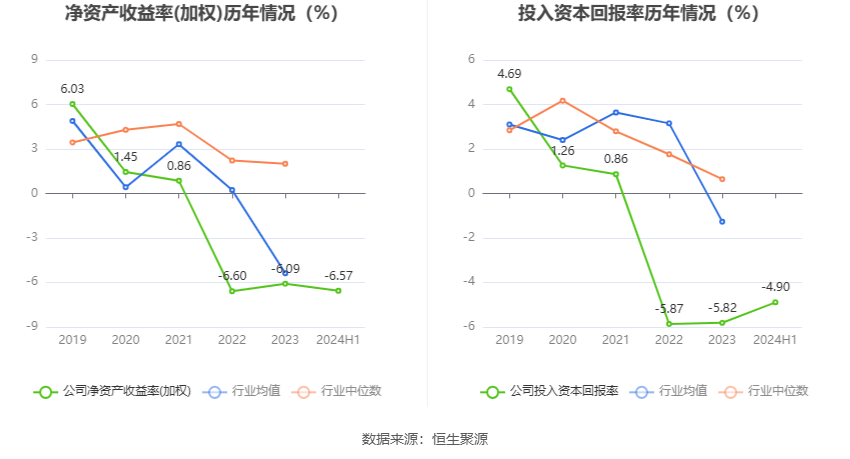 数据显示,2024年上半年公司加权平均净资产收益率为-6.57%,较上年同期下降5.61个百分点;公司2024年上半年投入资本回报率为-4.90%,较上年同期下降4.25个百分点。