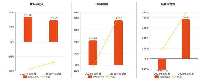 公司营业总收入为16.40亿元,较去年同报告期营业总收入减少2.69亿元,同比较去年同期下降14.10%。归母净利润为22.60亿元。经营活动现金净流入为1.61亿元,在已披露的同业公司中排名第37。