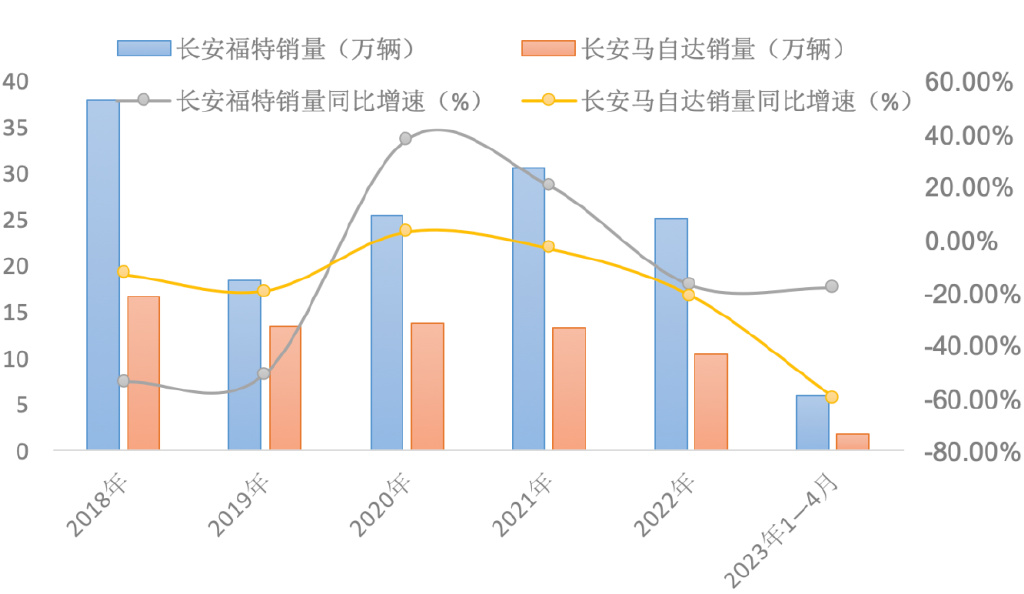 值得注意的是,今年前四个月,该公司自主品牌汽车销量同比增长“个位数”,长安福特、长安马自达的销量均同比下滑,后者降幅近六成。若拉长时间来看,长安福特与长安马自达合计销量占比也降至10%以下,与2017年、2018年时相比落差较大。自主强、合资弱的局面较为明显。