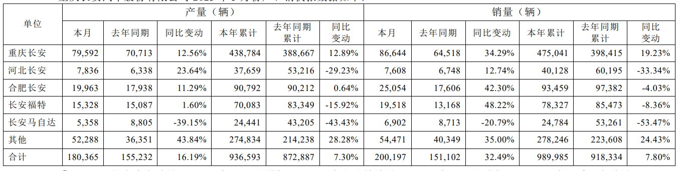 昨天(6月7日),长安汽车披露了5月产销数据。5月销量为20.02万辆,同比增长32.49%;1-5月销量为99万辆,同比增长7.80%。