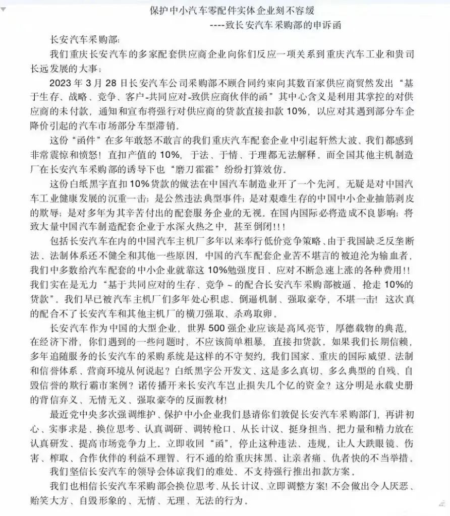 事件源起一封题为《保护中小汽车零配件实体企业刻不容缓--致长安汽车采购部的申诉函》(简称《申诉函》),内容如下图。其中提到,长安汽车采购部门向数百家供应商发函称,为应对价格战引发的部分车型滞销,将扣除10%的供应商货款。