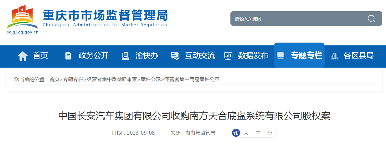 中国长安汽车集团有限公司收购南方天合底盘系统有限公司股权案