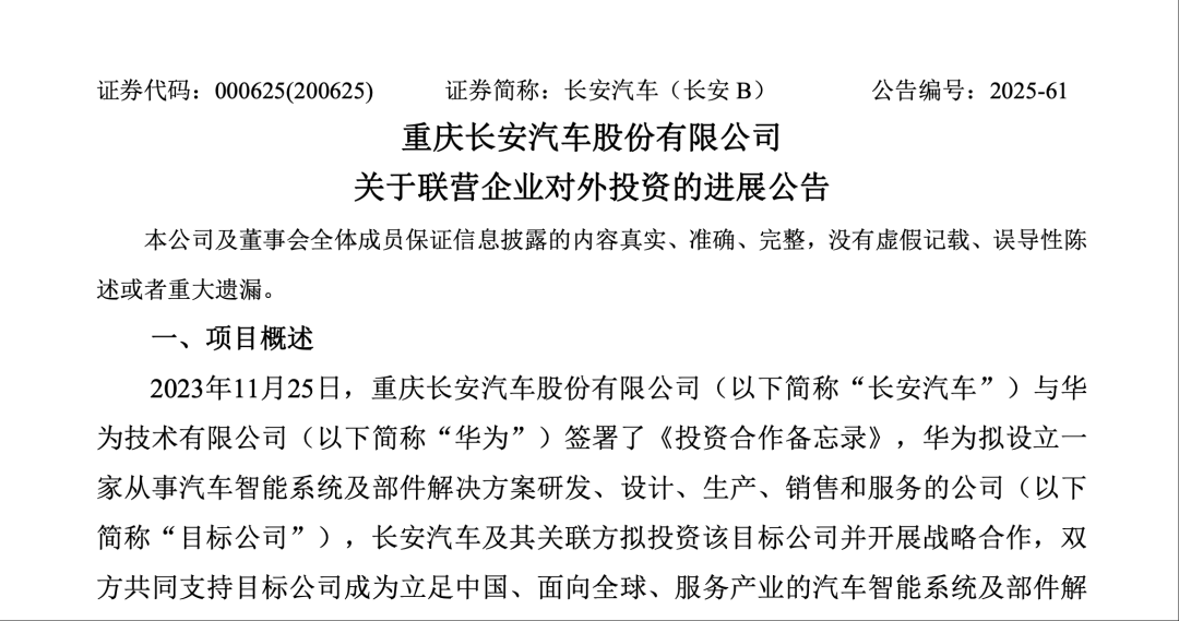 回顾合作历程,2023年11月25日,长安汽车与华为签署《投资合作备忘录》,华为拟设立专注汽车智能系统及部件解决方案的目标公司,长安汽车及其关联方拟投资并开展战略合作,旨在助力目标公司成为全球领先的汽车智能系统及部件解决方案产业领导者。2024年1月16日,华为完成目标公司注册,命名为深圳引望智能技术有限公司。