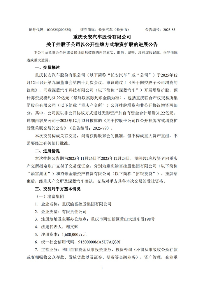 挂牌期内,渝富集团和招银投资支付保证金,具备受让资格。本次增资后,长安汽车持股 50.9959% 不变,渝富集团和招银投资分别持股 12.0934%、2.4187%。现金部分支付期限为协议生效、交割先决条件满足后 3 个工作日内和 2025 年 12 月 31 日前,无形资产部分交割后完成产权变更登记。