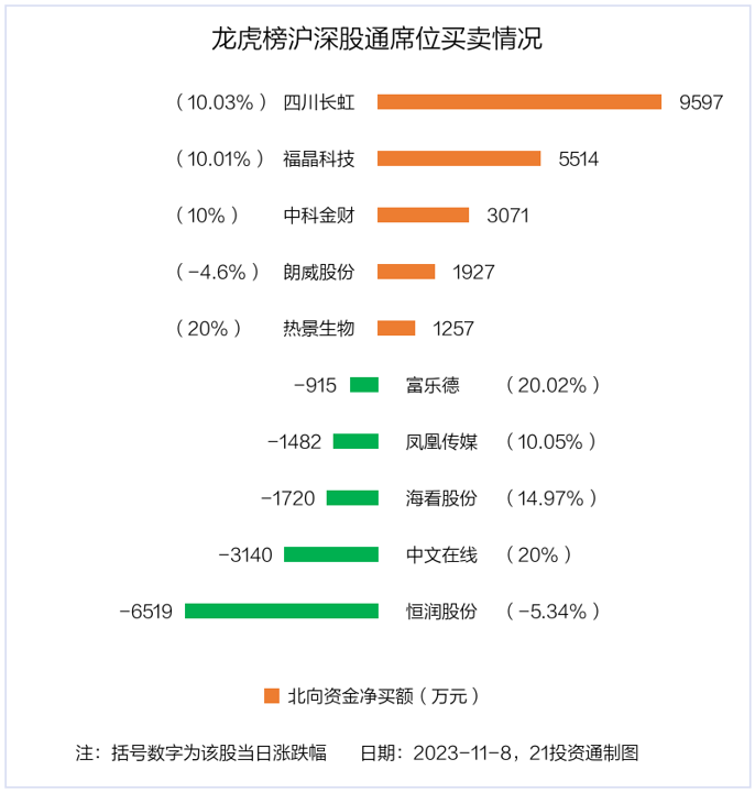 11月8日,北向资金参与龙虎榜中的个股共有10只,合计净买入7590.07万元。其中沪股通净买入2股,净卖出2股,合计净买入2852.45万元;深股通净买入3股,净卖出3股,合计净买入4737.62万元。