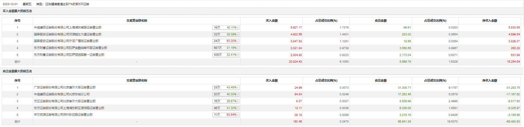 12月1日,高新发展今日涨停,全天换手率达28.49%,振幅达11.18%。龙虎榜数据显示,营业部席位合计净卖出5.12亿元。其中,中信建投证券上海浦东南路证券营业部、国泰君安证券河源越王大道证券营业部分别买入5927.17万元、4922.56万元;广发证券北京建外大街证券营业部、中信建投证券北京东城分公司分别卖出3.13亿元、1.73亿元。