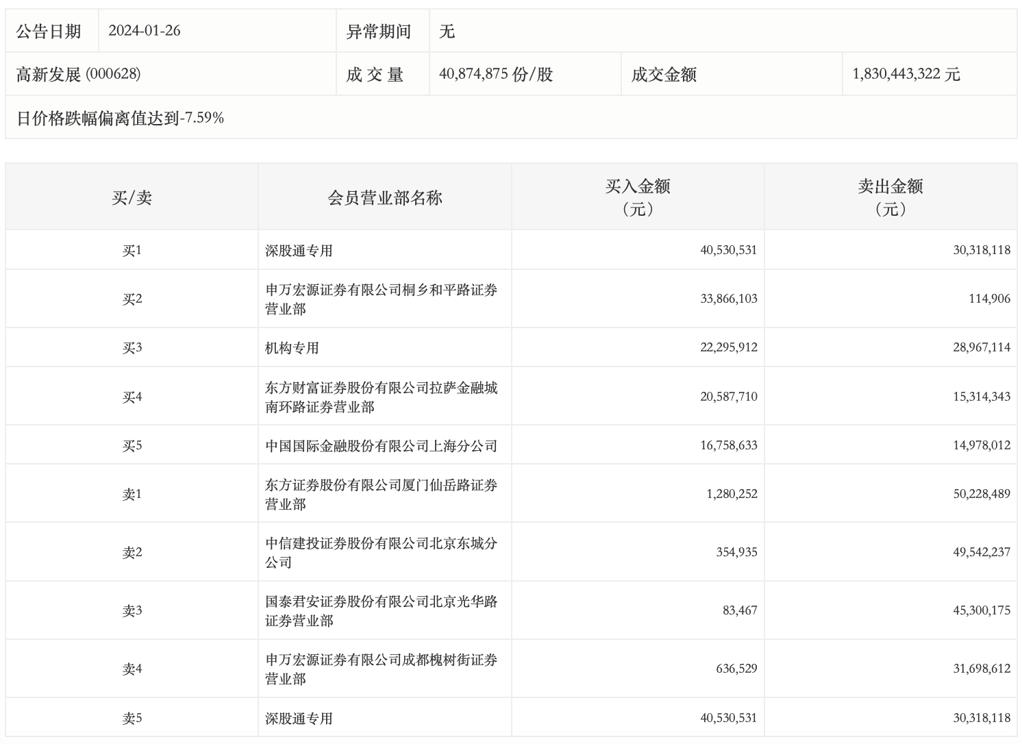 1月26日,高新发展今日跌8.3%,全天换手率达21.28%,振幅达7.83%。龙虎榜数据显示,营业部席位合计净卖出1.3亿元。其中,机构买入2229.59万元,卖出2896.71万元,合计净卖出667.12万元。此外,东方证券厦门仙岳路证券营业部、中信建投证券北京东城分公司分别卖出5022.85万元、4954.22万元;深股通专用、申万宏源证券有限公司桐乡和平路证券营业部分别买入4053.05万元、3386.61万元。