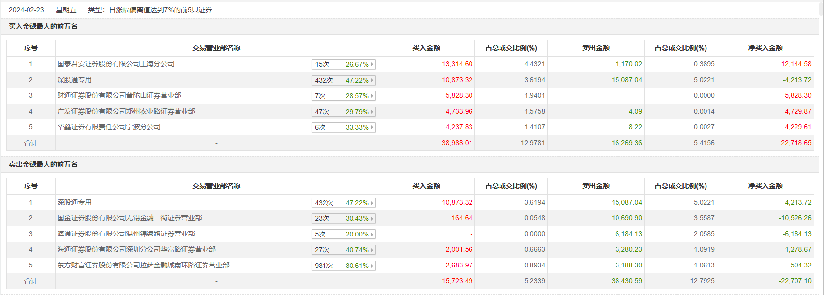 具体来看,国泰君安证券上海分公司、深股通专用分别买入1.33亿元、1.09亿元;深股通专用、国金证券无锡金融一街证券营业部分别卖出1.51亿元、1.07亿元。