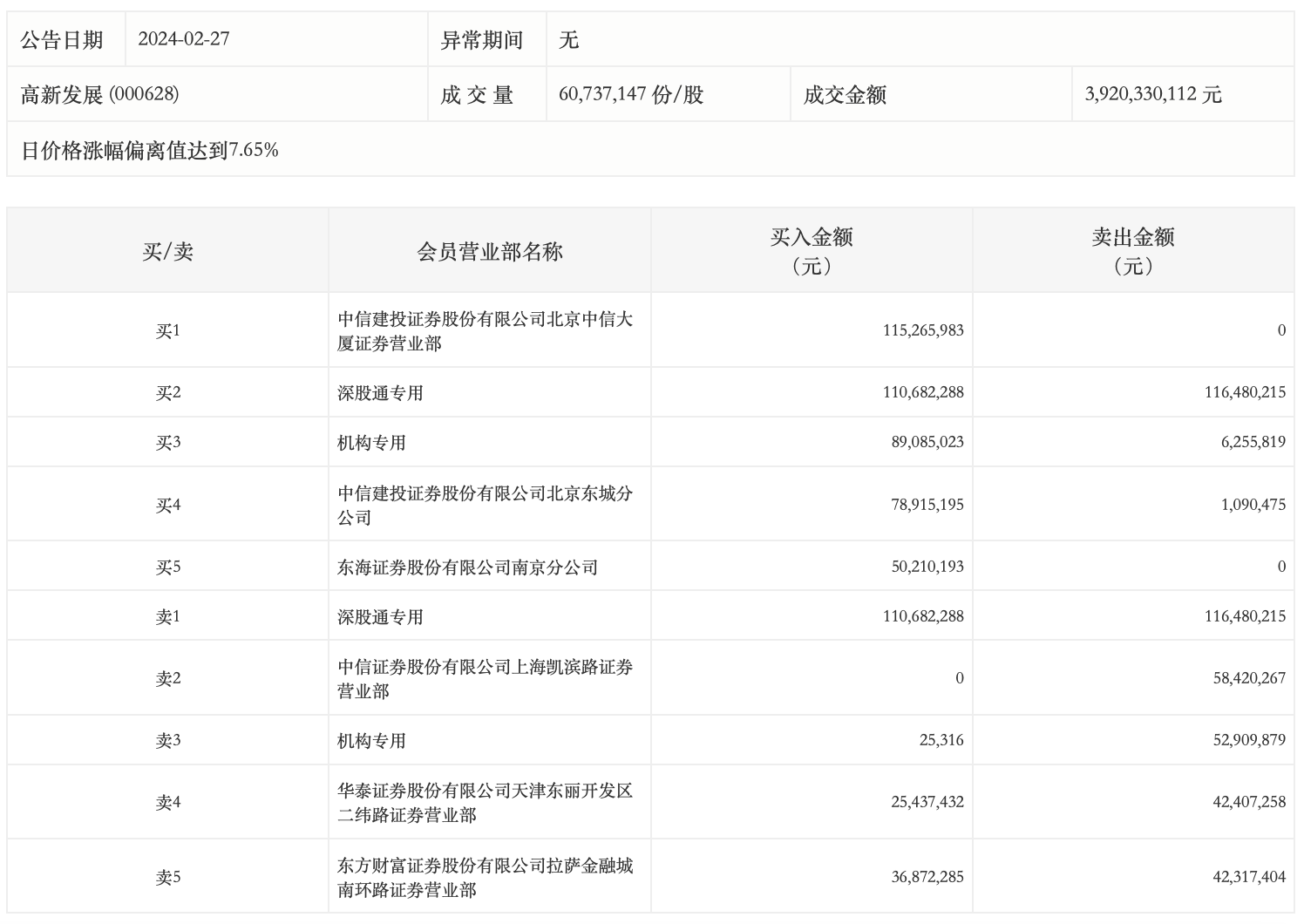 2月27日,高新发展今日涨停,龙虎榜数据显示,上榜营业部席位全天成交8.26亿元,占当日总成交金额比例为21.08%。其中,买入金额为5.06亿元,卖出金额为3.2亿元,合计净买入1.87亿元。