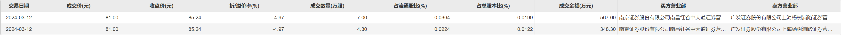 3月12日大宗交易成交11.3万股,成交额915.3万元,占当日总成交额的0.22%,成交价81元,较市场收盘价85.24元折价4.97%。