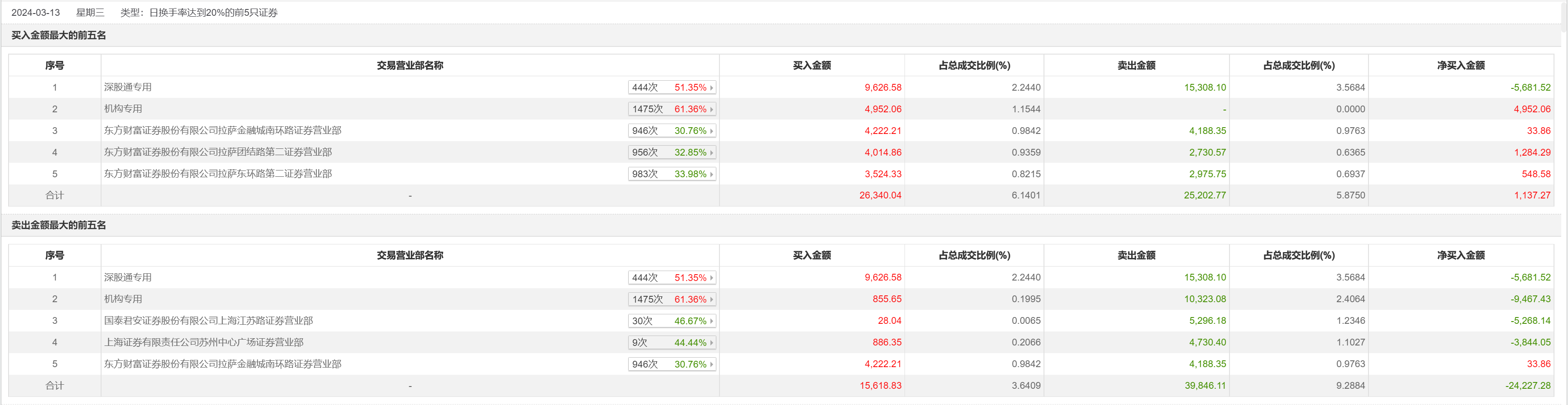 具体来看,机构买入5807.71万元,卖出1.03亿元,合计净卖出4515.37万元。此外,知名游资现身龙虎榜,深股通专用、章盟主(国泰君安证券上海江苏路证券营业部)分别卖出1.53亿元、5296.18万元;深股通专用、东方财富证券拉萨金融城南环路证券营业部分别买入9626.58万元、4222.21万元。