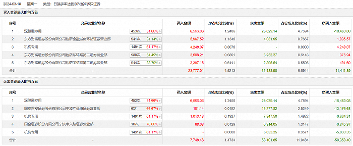 高新发展3月18日涨4.17%,成交额52.59亿元,换手率31.63%,盘后龙虎榜数据显示,深股通专用席位买入6566.06万元并卖出2.50亿元,一机构净买入4248.07万元,二机构净卖出1.19亿元。