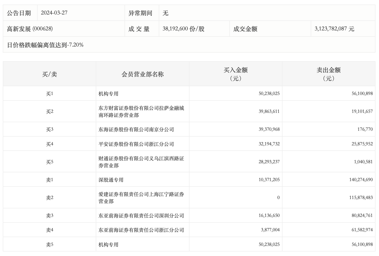 3月27日,高新发展今日跌停,全天换手率达19.88%,振幅达5.05%。龙虎榜数据显示,营业部席位合计净卖出2.81亿元。其中,机构买入5023.8万元,卖出5610.09万元,合计净卖出586.29万元。此外,深股通专用、爱建证券上海江宁路证券营业部分别卖出1.40亿元、1.16亿元;东方财富证券拉萨金融城南环路证券营业部、东海证券南京分公司分别买入3986.36万元、3937.10万元。