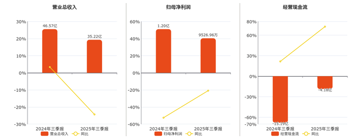 公司营业总收入为35.22亿元,在已披露的同业公司中排名第8,较去年同报告期营业总收入减少11.34亿元,同比较去年同期下降24.36%。归母净利润为9526.96万元,在已披露的同业公司中排名第6,较去年同报告期归母净利润减少2517.84万元,同比较去年同期下降20.90%。经营活动现金净流入为-4.18亿元,在已披露的同业公司中排名第2,较去年同报告期经营活动现金净流入增加11.00亿元,实现2年连续上涨。