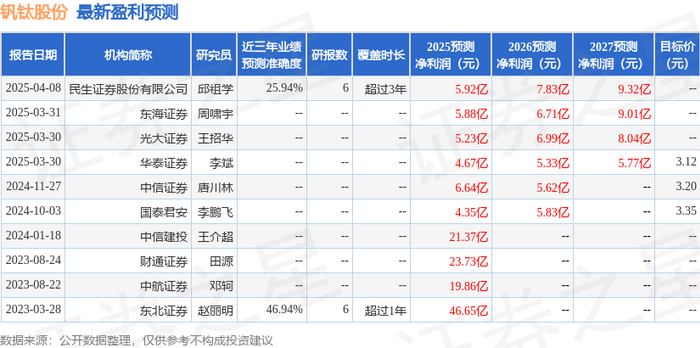 钒钛股份2025年中报显示,公司主营收入42.54亿元,同比下降40.57%;归母净利润-1.99亿元,同比下降245.15%;扣非净利润-2.01亿元,同比下降256.64%;其中2025年第二季度,公司单季度主营收入21.32亿元,同比下降40.3%;单季度归母净利润-1.01亿元,同比下降246.47%;单季度扣非净利润-9836.35万元,同比下降256.78%;负债率13.88%,投资收益2884.51万元,财务费用-1443.9万元,毛利率4.93%。