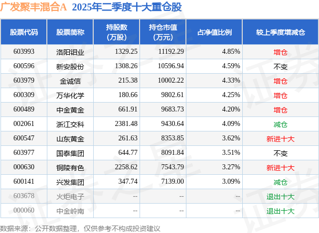 根据2025基金半年报公募基金重仓股数据,重仓该股的公募基金共11家,其中持有数量最多的公募基金为广发基金的广发聚丰混合A。广发聚丰混合A目前规模为22.76亿元,最新净值0.6882(10月13日),较上一交易日上涨0.09%,近一年上涨38.78%。该公募基金现任基金经理为苏文杰。苏文杰在任的基金产品包括:广发优势成长股票A,管理时间为2024年10月25日至今,期间收益率为37.34%;广发资源优选股票A,管理时间为2025年6月17日至今,期间收益率为28.39%;广发成长动力三年持有混合A,管理时间为2025年7月2日至今,期间收益率为24.52%。