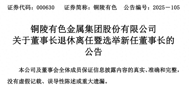 10月27日,铜陵有色(000630.SZ)发布《关于董事长退休离任暨选举新任董事长的公告》,该公告显示,日前公司董事会收到董事长龚华东的辞职报告,因到法定退休年龄,龚华东申请辞去公司董事长、董事等职务,辞职后不在公司及控股子公司任职。