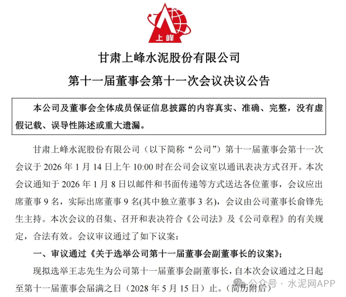 1月14日晚,上峰水泥发布公告,公司于1月14日召开第十一届董事会第十一次会议。