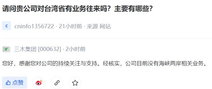 V观财报|三木集团:公司目前没有海峡两岸相关业务