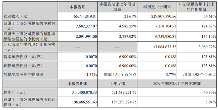 报告显示,合金投资前三季度营业收入为2.30亿元,同比增长54.61%;归母净利润为725.81万元,同比增长124.87%;扣非归母净利润为676.00万元,同比增长134.10%;基本每股收益0.02元。