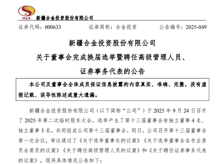 9月24日晚,合金投资发布换届公告,董事会同意选举柴宏亮担任公司第十三届董事会董事长,任期三年,自本次董事会审议通过之日起至第十三届董事会任期届满之日止。同时,董事会同意聘任姜秋野为公司总经理,任期三年,自本次董事会审议通过之日至第十三届董事会届满之日止。